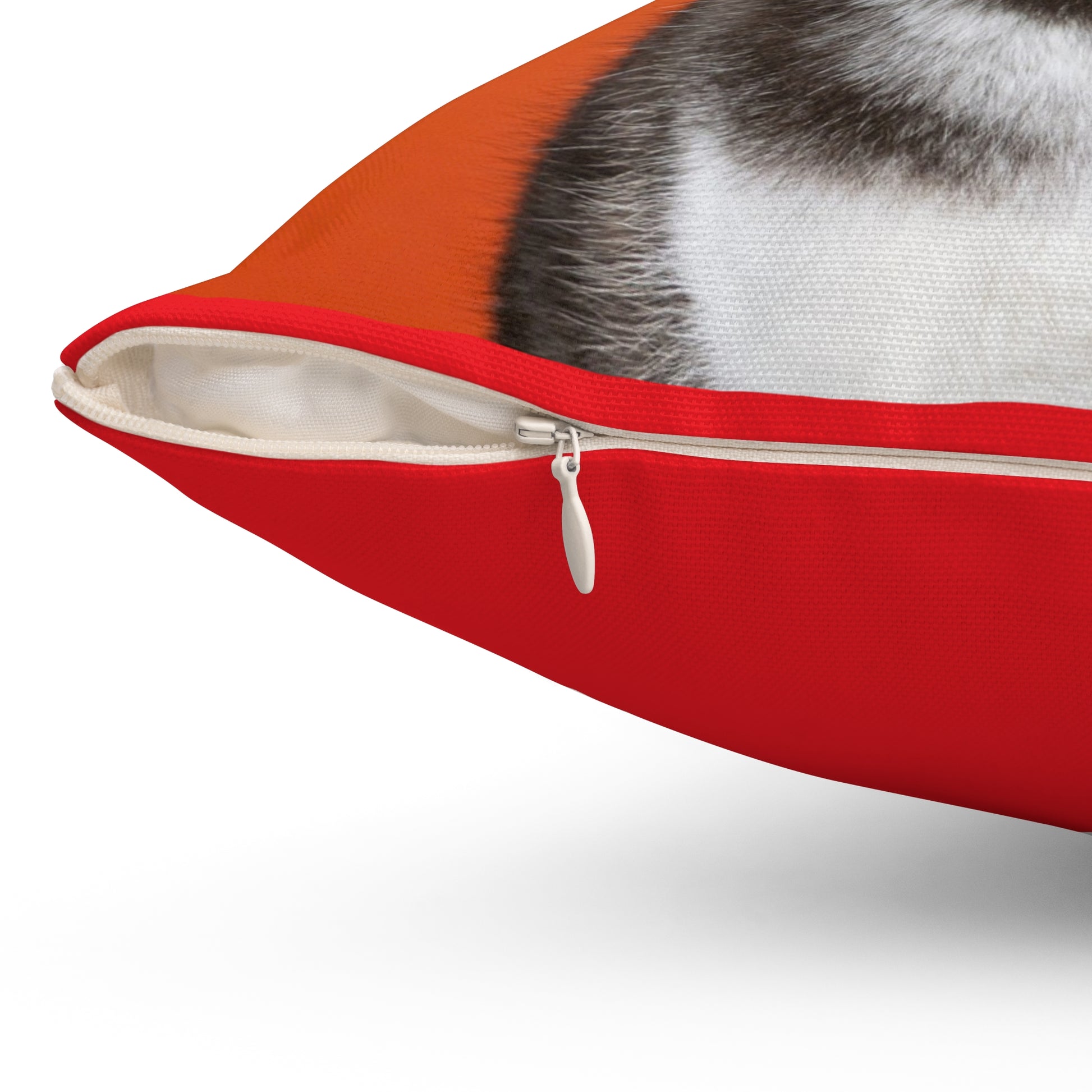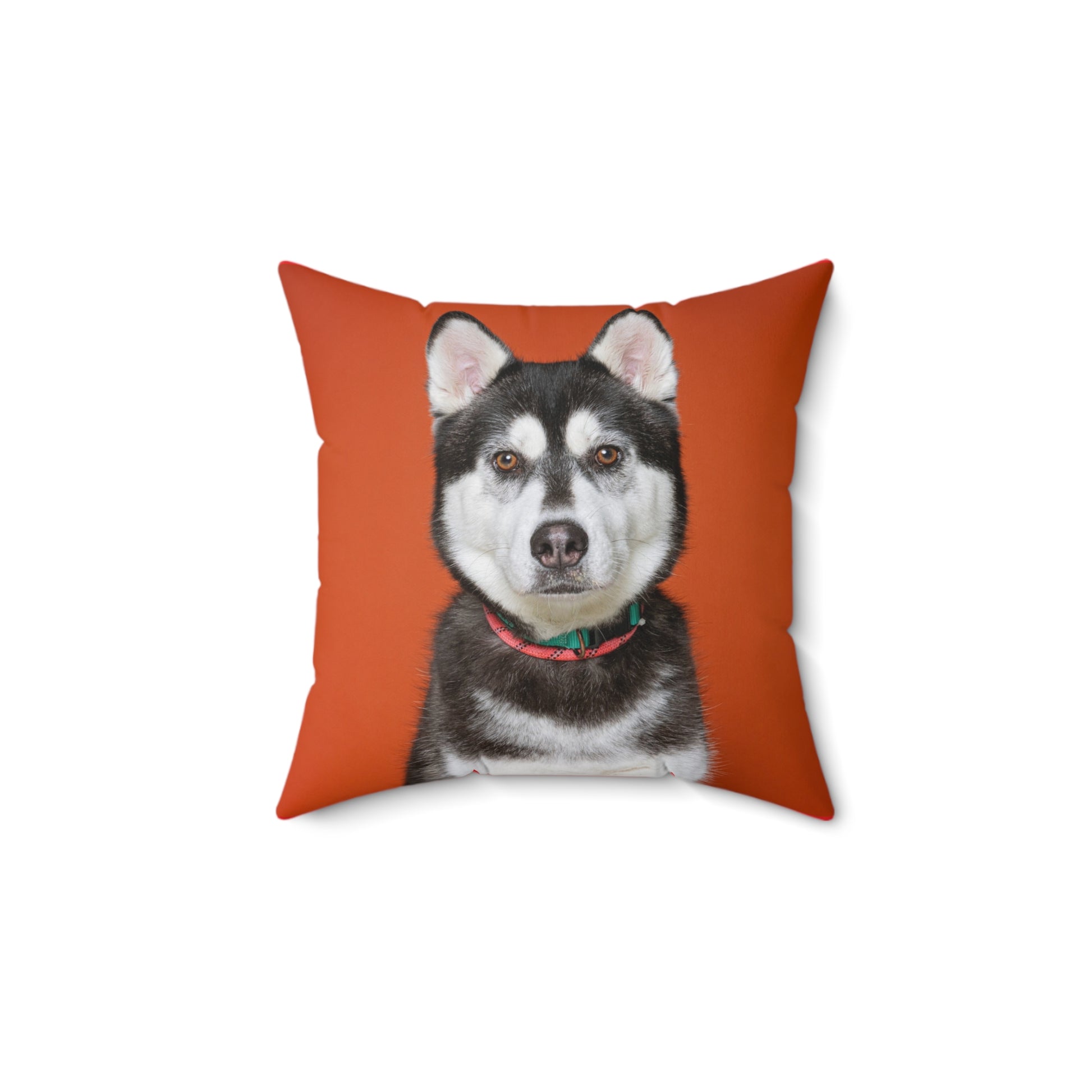 A cozy, double-sided spun polyester pillow that brings a bold pop of color and personality to any room. The front showcases a striking portrait of a husky rendered against a warm terracotta backdrop, while the back offers a solid, vibrant red to anchor the design. The cover resists wrinkles and keeps its shape, with a concealed beige zipper that blends seamlessly into the edge. Insert ships separately and is slightly oversized so when you stuff the cover you get a full, plump cushion with soft loft. Use it on a couch, a reading nook, or a favorite armchair to add warmth and a playful, pet-loving touch to your space.
